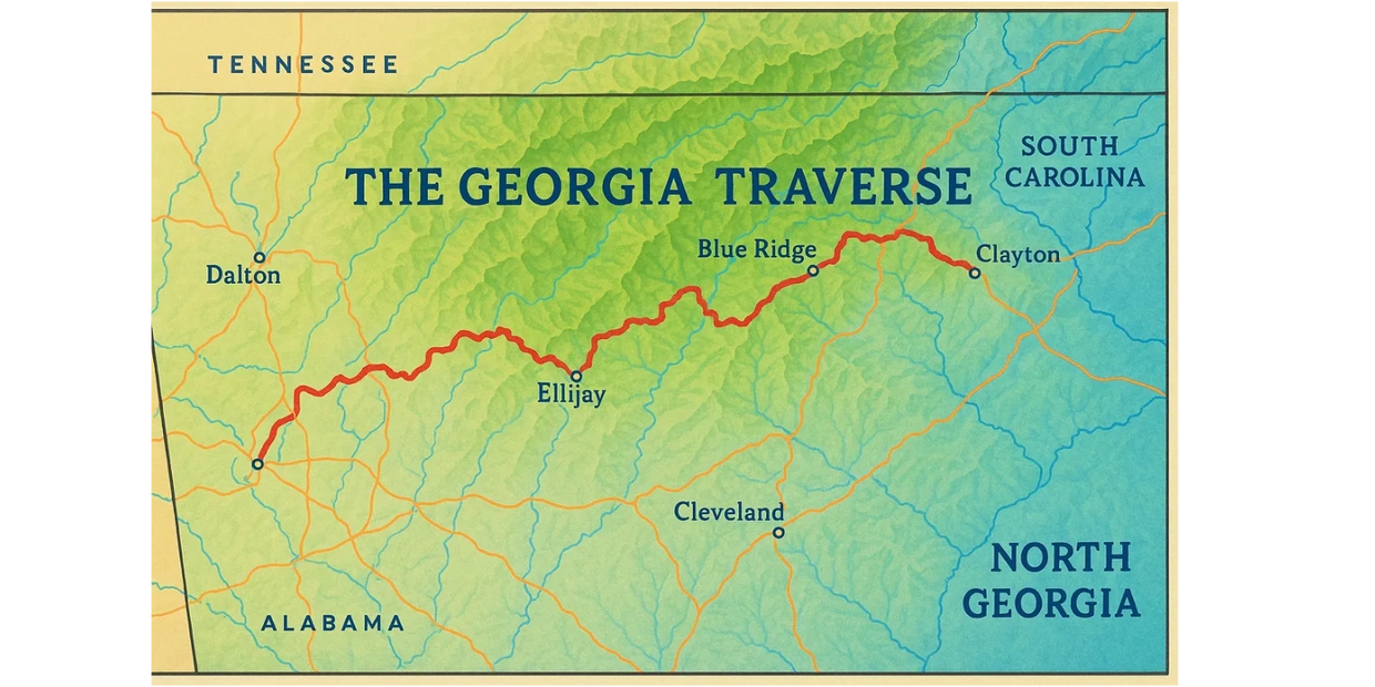 Imagine packing your snacks, grabbing your favorite people (or fur-buddies!), and heading out where the GPS says “recalculating” more than “left turn ahead.” The Georgia Traverse zigzags across northern Georgia, dipping its tires in neighboring states and winding you through forests, over rivers, past waterfalls, and right up next to jaw-dropping Appalachian panoramas.